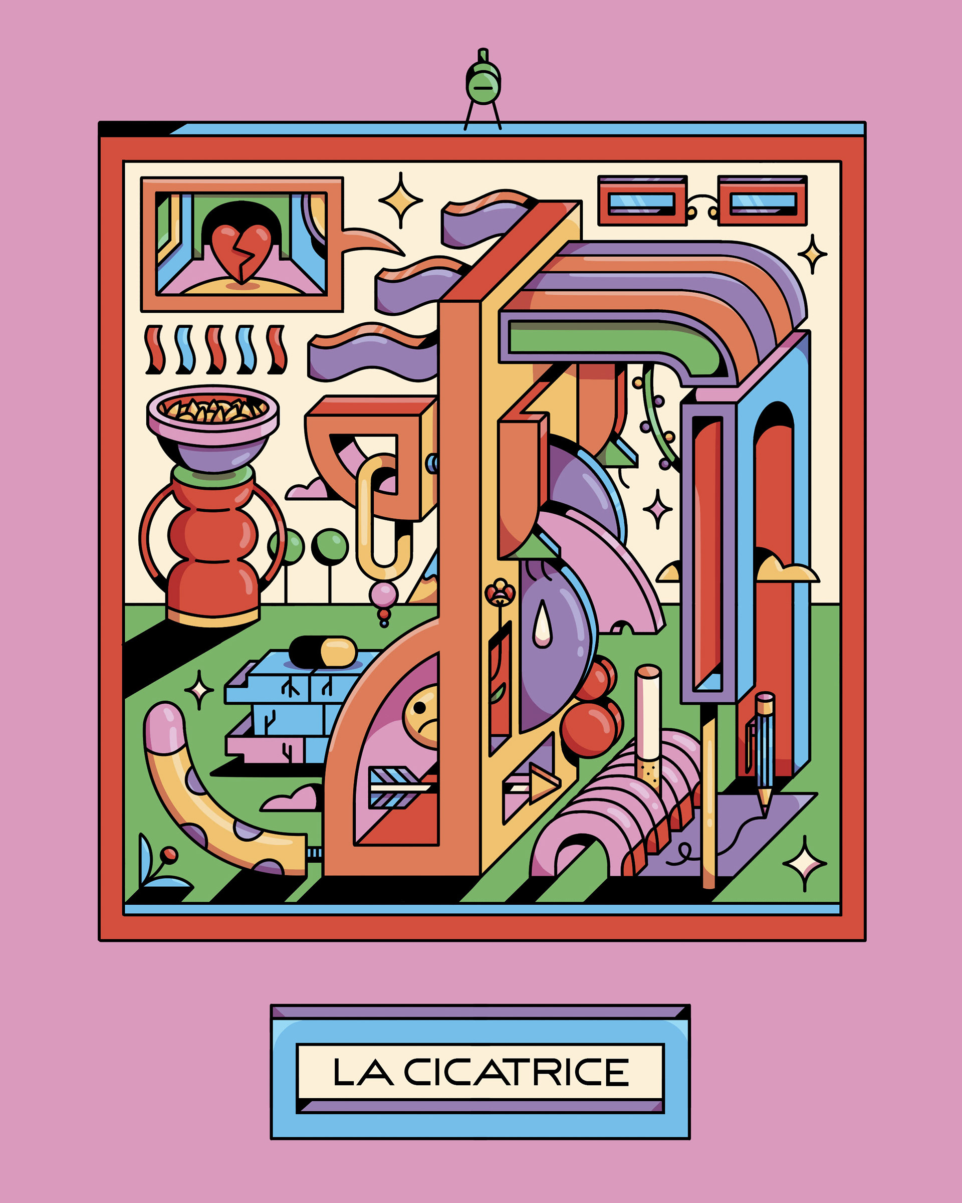 I segni diventano qui geometrie emotive: forme astratte che raccontano l’asimmetria, le fratture, ma anche la possibilità di una nuova composizione. Il progetto intreccia così arte, autobiografia e amore, riconoscendo nella cicatrice un atto sovversivo: non più da celare, ma da mostrare come prova di sopravvivenza e libertà.