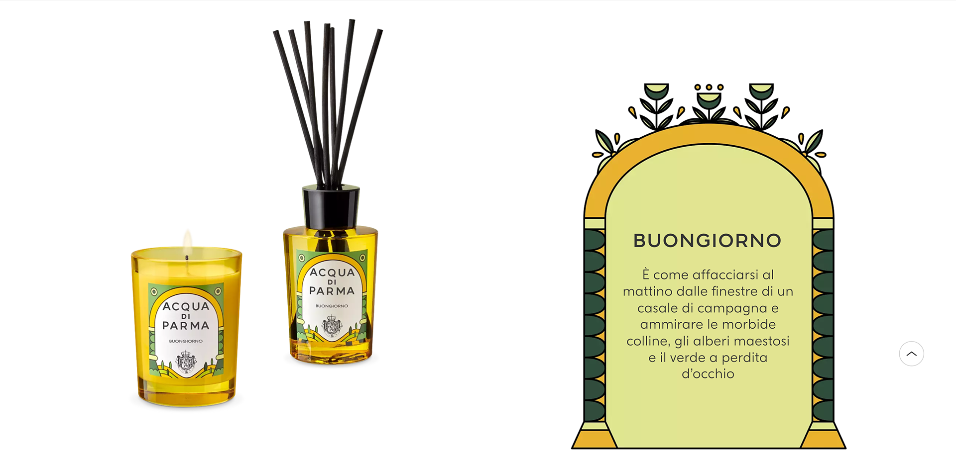 Morbide colline, alberi maestosi, distese di verde e paesaggi inondati dal sole italiano decorano l'inconfondibile etichetta della bottiglia in vetro giallo di Acqua di Parma. E nell'aria il profumo dell'erba appena tagliata dona una sensazione di morbida freschezza insieme ai toni naturali del legno e del muschio che danno rotondità e comfort alla fragranza, per un meraviglioso Buongiorno. Ed è come spalancare le finestre e risvegliarsi nell'incantevole campagna italiana.