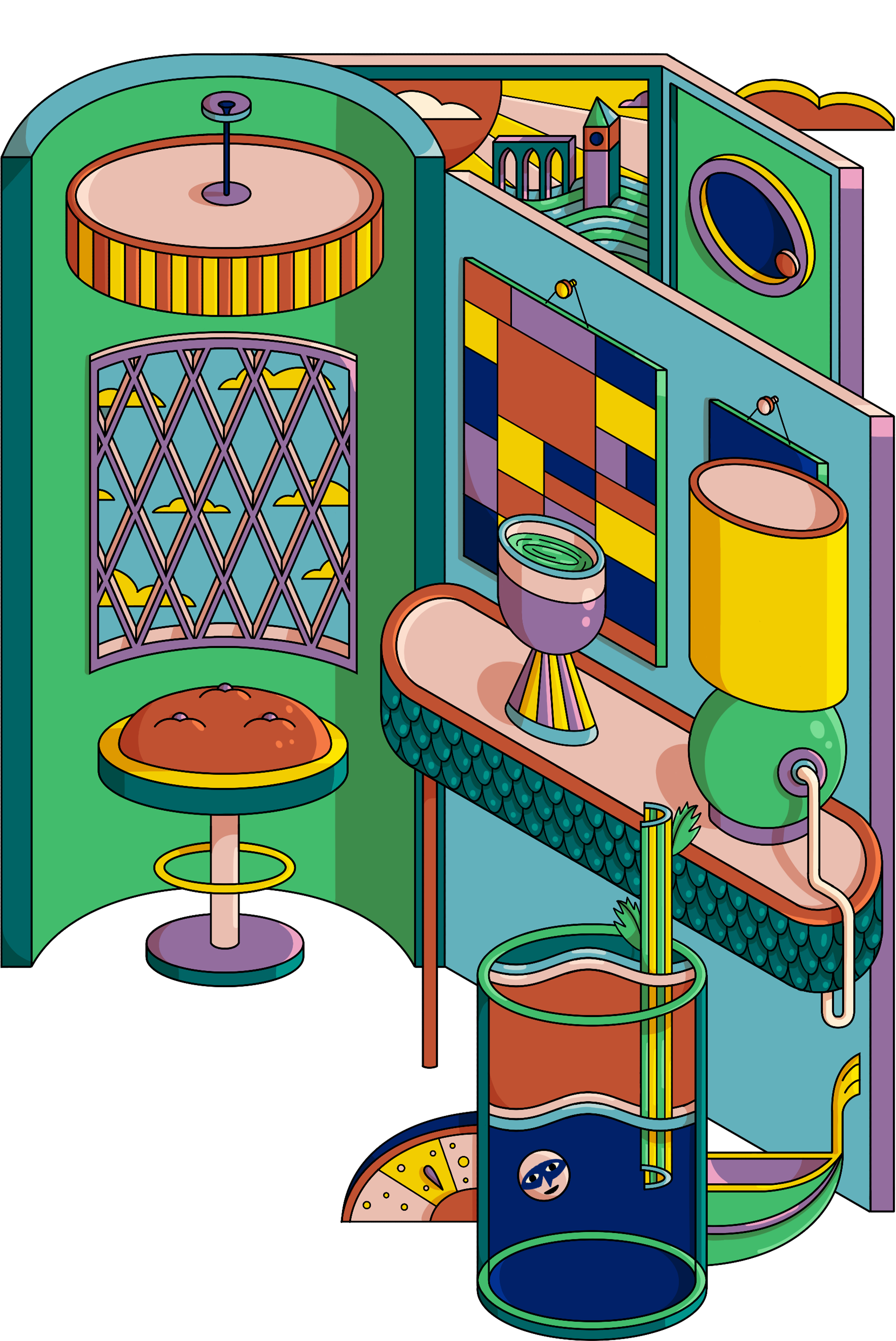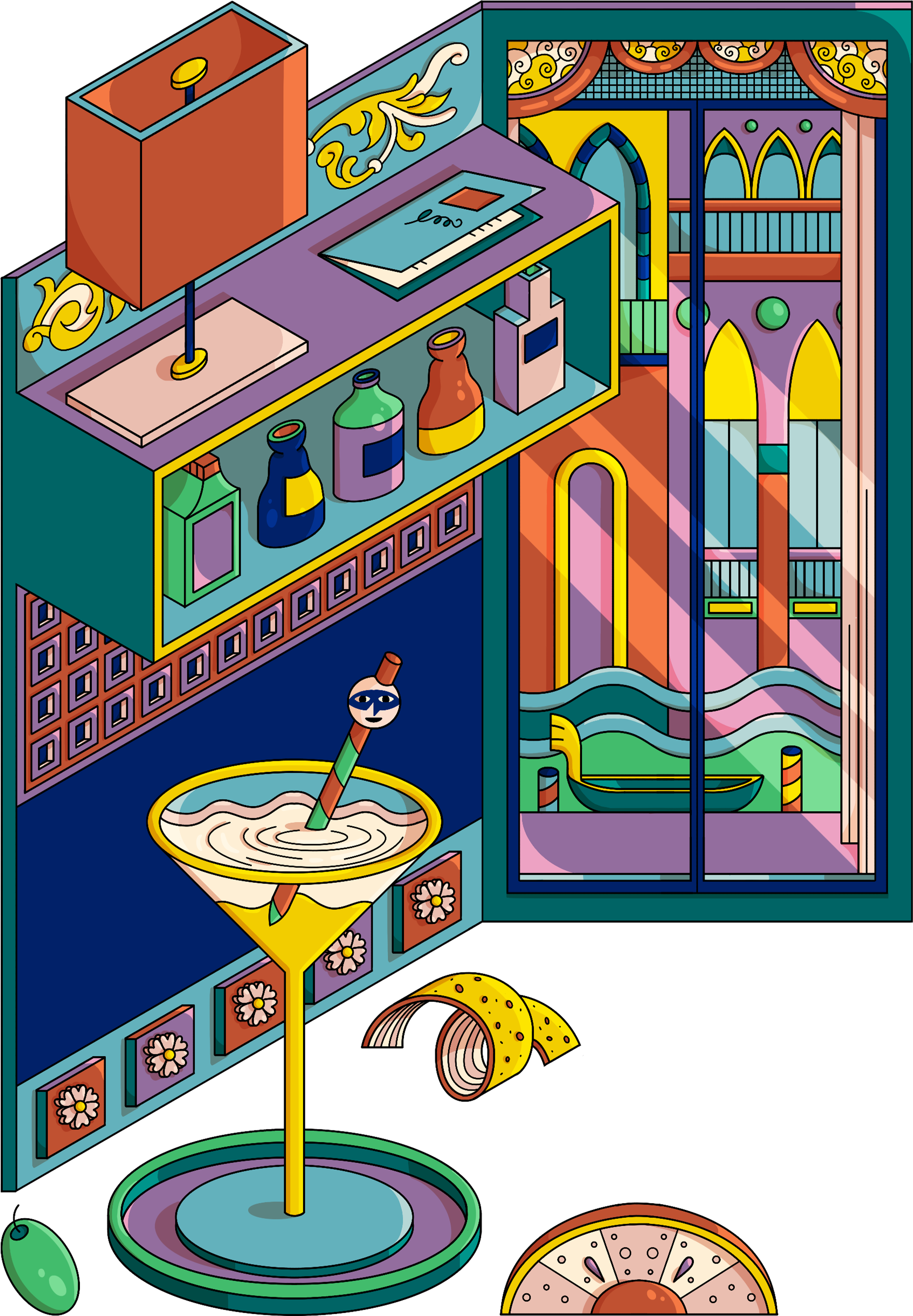 Le illustrazioni che accompagnano ogni creazione combinano riferimenti culturali e architettonici del luogo d’origine con elementi ispirati a Venezia, sede del progetto.
